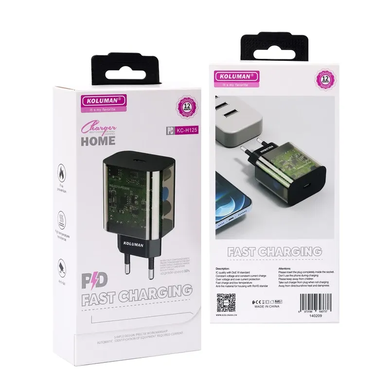 شارژر دیواری 20 وات کلومن KC-H125 فست شارژ با گارانتی ۱۲ ماهه، طراحی مشکی و جمعوجور. مناسب برای شارژ سریع گوشی، تبلت و دستگاههای مجهز به درگاه USB. خرید آنلاین شارژر KC-H125 با قیمت مناسب و کیفیت تضمینی.