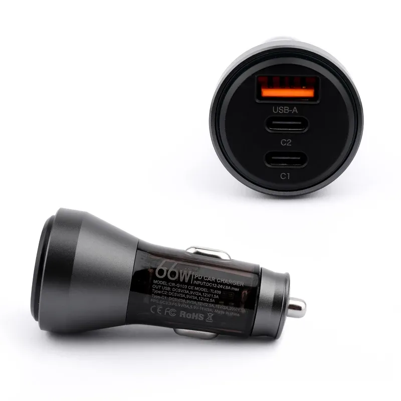 شارژر فندکی 66 وات کربی CR-G103 فست شارژ سه‌گانه با طراحی مشکی و گارانتی ۱۲ ماهه. مناسب برای شارژ همزمان سه دستگاه با سرعت بالا و ایمنی کامل. خرید آنلاین شارژر فندکی اصل.